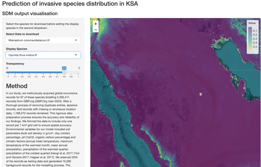 An interactive map for 67 species of concern shows the habitat suitability from 0 to 1. https://um1s0p-philipp-robeck.shinyapps.io/Vis_SDM/ Several species, such as Lantana camara and Prosopis juliflora, are widely recognised for their economic uses (horticulture, fodder), likely contributing to their widespread distribution and naturalisation in KSA.