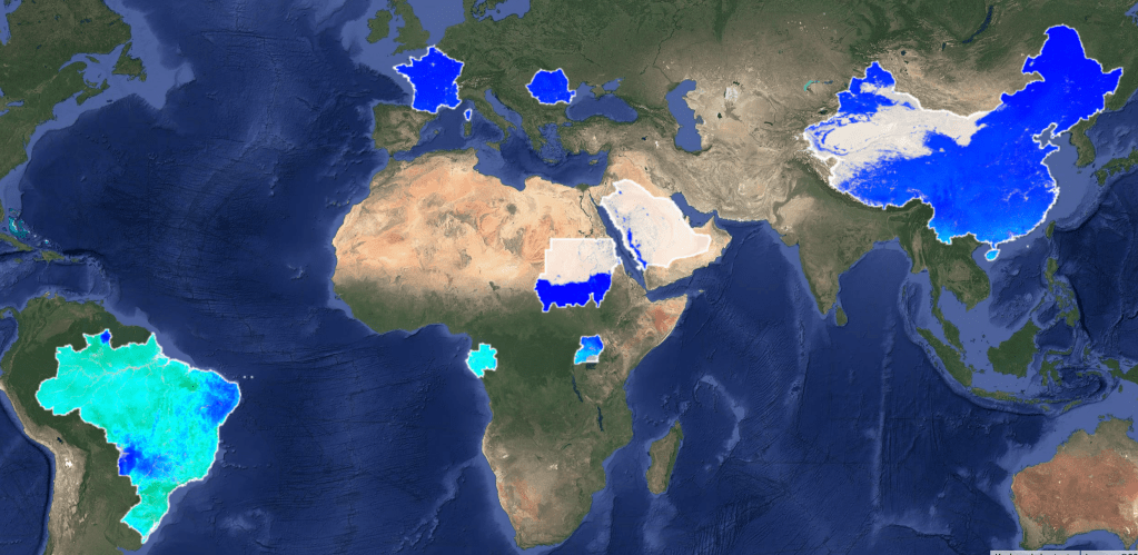 We compared the ET of several countries using a script on Google Earth Engine using a low-resolution dataset. The script mapped the ET of several countries Saudi Arabia, Gabon, Uganda, Sudan, France, Romania, China, Brazil for two months (2024-01-01 to 2024-01-31) and (2024-08-01 to 2024-08-31) (Figure 1 and Figure 2). This script processes and visualizes evapotranspiration (ET) data from the MODIS MOD16A2 dataset. MOD16A2 reports ET in kg/m², which is numerically equivalent to mm of water lost through evaporation and transpiration. The dataset requires a scale factor of 0.1, so etImageMM = etImage.multiply(0.1) converts ET values to mm/month.